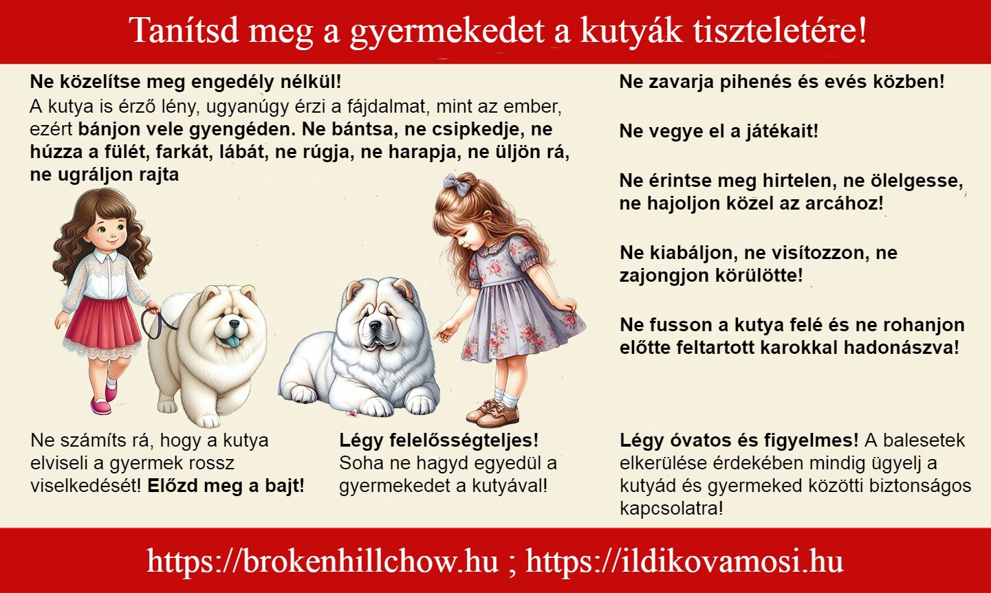 - Gyermekekkel szemben: Azért, mert olyan, mint a plüssmaci és kifejezetten a gyermek kérésének engedve semmiképpen sem ajánlom! A chow egy önálló, független természetű és makacs kutya, aki nem türelmes a gyermekekkel és nem tűri az állandó zaklatást. Nem kedveli a vicceket, a kemény játékot és az ugratást sem, mivel nem érti, de komolyan veszi, még az is lehet, hogy harapás lesz a vége. Emiatt sem jó játszótárs kisgyermekeknek.
